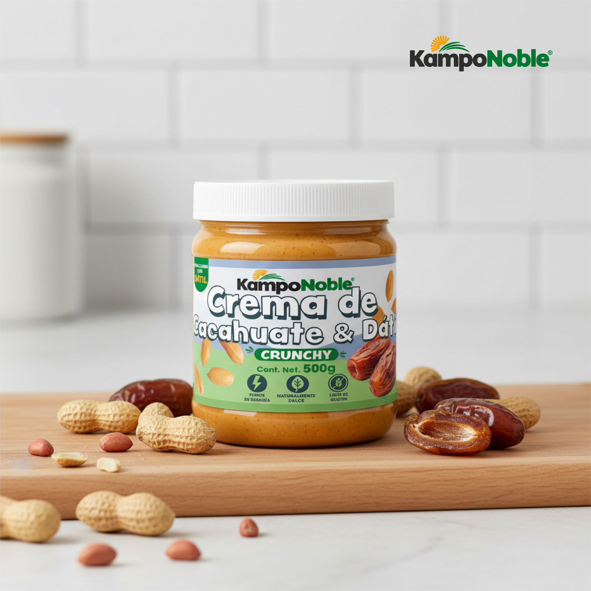 Crema crujiente de cacahuate tostado, endulzada naturalmente con dátil.