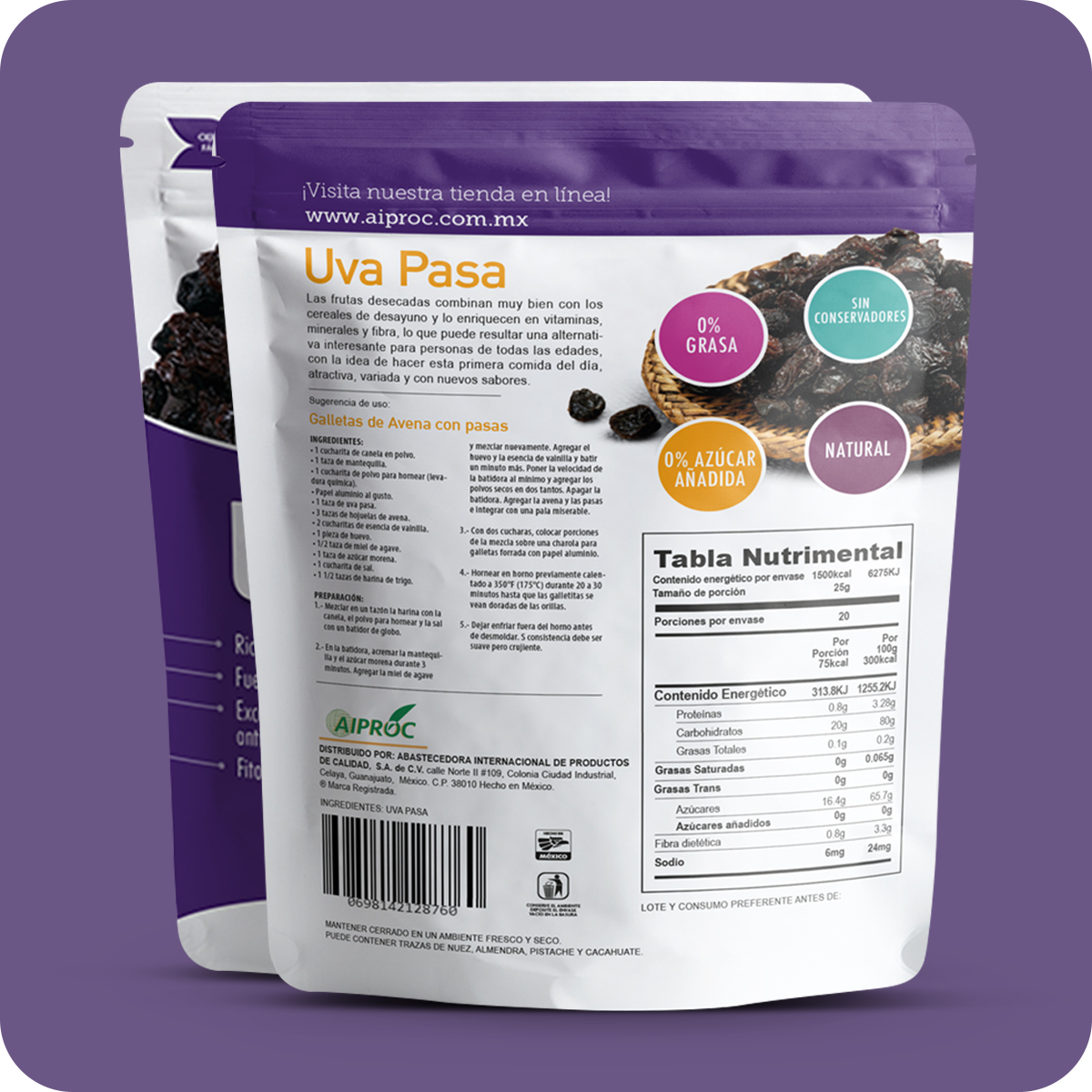 Empaque de Alta Calidad: La bolsa con interior metalizado preserva la frescura de las uvas pasas, protegiéndolas de la humedad y el aire para garantizar su textura jugosa y su sabor concentrado.